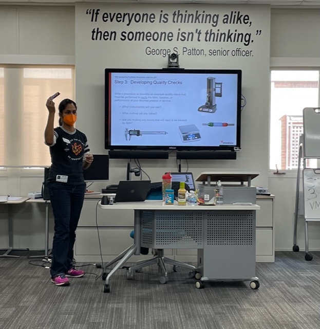 Meena and Rick presented the students with the basic steps required to make a viable product. Their presentation consisted of a brief explanation of who PHOENIX is, what we produce, and a 10-step breakdown of manufacturing. The key concepts they covered included prototyping, defining technical specifications, identifying raw materials, developing quality checks, selecting packaging, evaluating processes and equipment, addressing waste management, and creating a flow diagram. Many of the students had already built prototypes prior to PHOENIX’s visit, so they were able to apply our manufacturing process checklist right away to advance their designs.