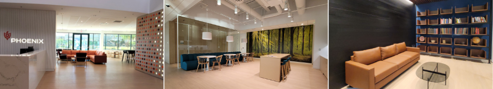 This state-of-the-art, modernized 41,375 sq. ft. office was furnished by Forward Space and comes equipped with an ideation room, R&D lab, two full-sized kitchens, a gym, library area, and numerous conference rooms, meeting areas, and quiet rooms for employees and customers alike. “We know a business is only as good as its team and wanted a space where they can work together, collaborate, and make great things happen. Feedback from employees impacted the design of the office to best represent PHOENIX and our company culture,” said PHOENIX Co-President, Alby Miller.
