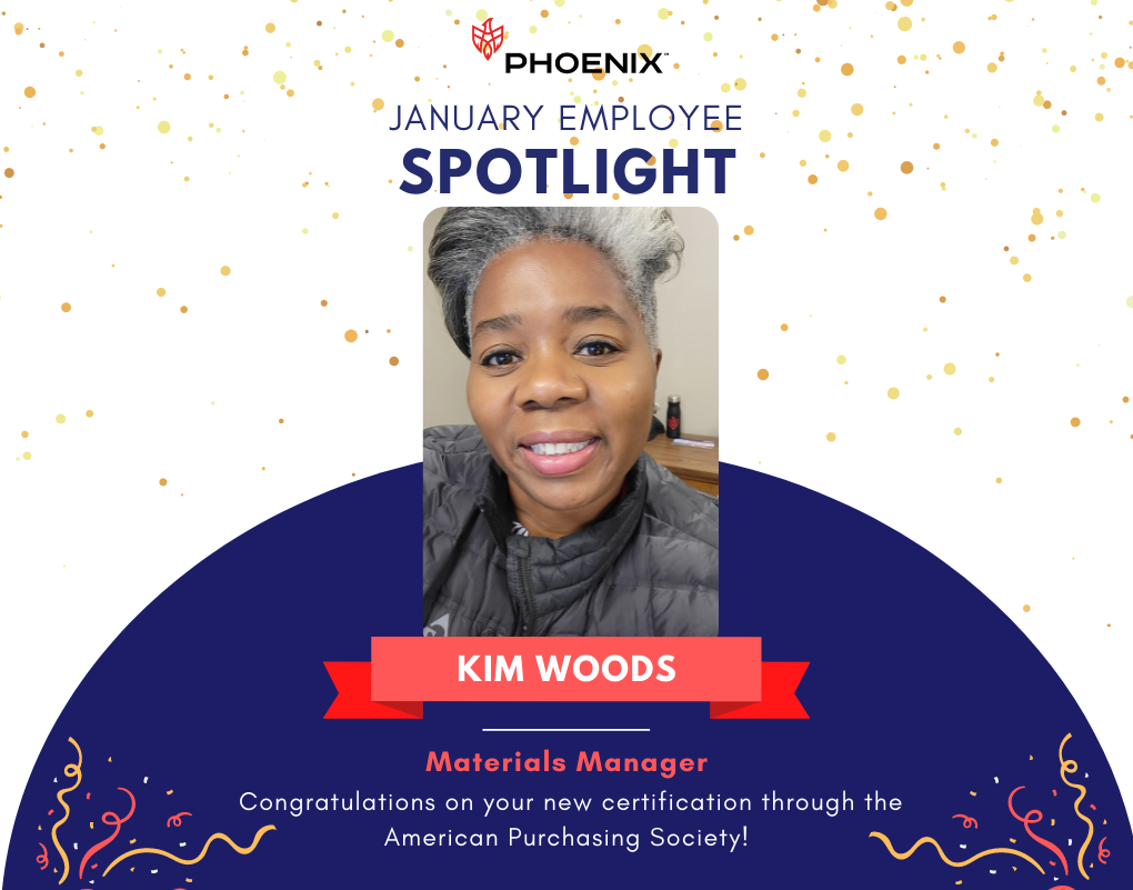 PHOENIX Phamily (our employees) are the heart and soul of our company! Our phamily members are always working to increase their knowledge, do interesting things, start amazing hobbies and come from diverse backgrounds. Throughout 2022, we thought you might want to get to know some of the people that make PHOENIX tick by sharing a monthly Employee Spotlight where we interview an employee who has done something unique and interesting in the last month. This month we are connecting with Kim Woods, PHOENIX Materials Manager at our corporate office.